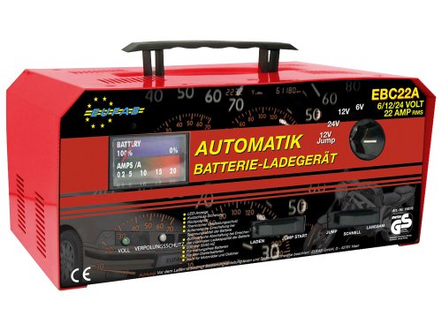 - Ladespannung: 6 V 22/33 A umschaltbar12 V 3/10 A umschaltbar24 V 8/11 A umschaltbar- Netzanschluss: 230 V, 50/60 Hz- Mit Amperemeter: ja- Automatische Sicherung: bei Kurzschluss- Größe (LxBxH): ca. 32 x 20,5 x 15 cm- Gewicht: ca. 9 kg- TÜV-/GS-geprüft: ja- CE: ja- Kann zur Spannungserhaltung verwendet werden, d.h. bei Erfüllen der Ladekapazität der Batterie schaltet sich das Gerät automatisch ab und bei Abfall der Batterieleistung automatisch wieder ein- Formschönes Metallgehäuse mit integriertem Tragegriff und LED- und Ladezustandsanzeige Die Firma EAL steht für hochwertige Produkte der Firmen EUFAB, APA und LAS. Das Unternehmen EAL GmbH, welches in Wuppertal ansässig ist, wurde im Juni des Jahres 2009 neu gegründet. Das Unternehmen hat 50 Mitarbeiter beschäftigt und zeichnet sich durch eine innovatives und hochwertiges Sortiment, sowie beste Service-Leistungen aus. Die Marke EUFAB hat sich dabei seit 16 Jahren vor allem auf den Bereich Fahrradtransport spezialisiert und stellt dort einen der Marktführer in Deutschland dar. EUFAB bietet dabei die unterschiedlichsten Transportlösungen für Fahrräder, ob auf dem Dach, der Anhängerkupplung, der Heckklappe, oder der Deichsel, an. Auch die Marke APA ist durch über 50 Jahre Erfahrung ein Marktführer im Bereich Autopflege und Starthilfe. Das Angebot der Marke APA umfasst darüber hinaus aber auch noch Autowaschbürsten, Schwämme, Abschleppseile und -stangen, Starthilfekabel, Bürsten, Automatten, Batteriezubehör, Sonnenschutzfolien und Winterzubehör. Die dritte Marke stellt LAS dar, welche seit 2008 in Deutschland eingeführt wurde und sich seit dem im Anhänger-, Camping-, Caravan- und Rangierhilfen-Bereich einen Namen machen konnte. Sollten Sie zu den EAL Produkten